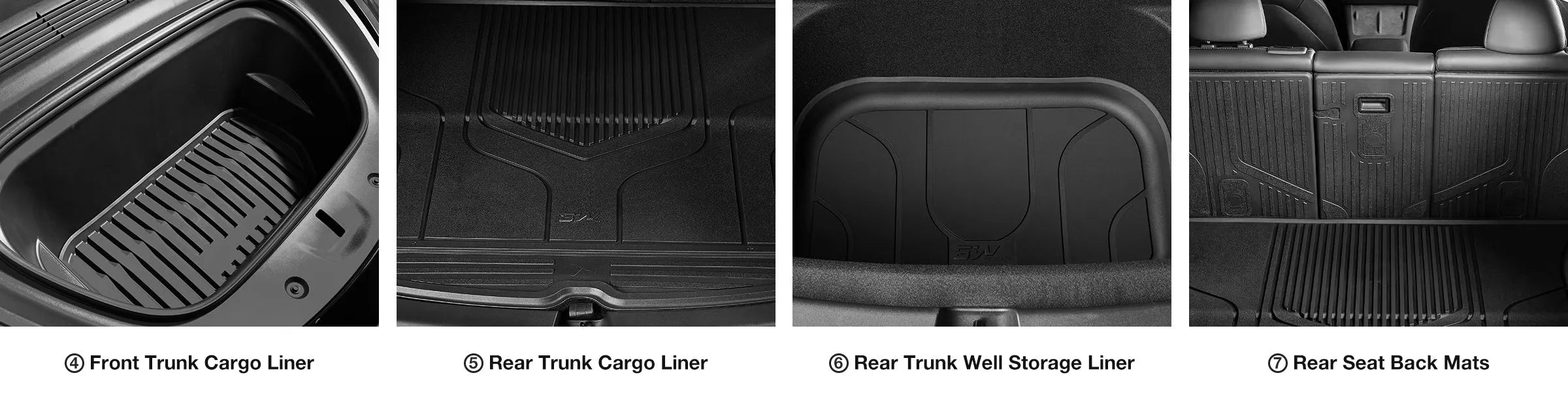 • 6 PCS Set Includes: Driver Side Liner, Passenger Side Liner, Rear Seat Liner, Front Trunk Cargo Liner, Rear Trunk Cargo Liner, Rear Trunk Well Storage Liner.