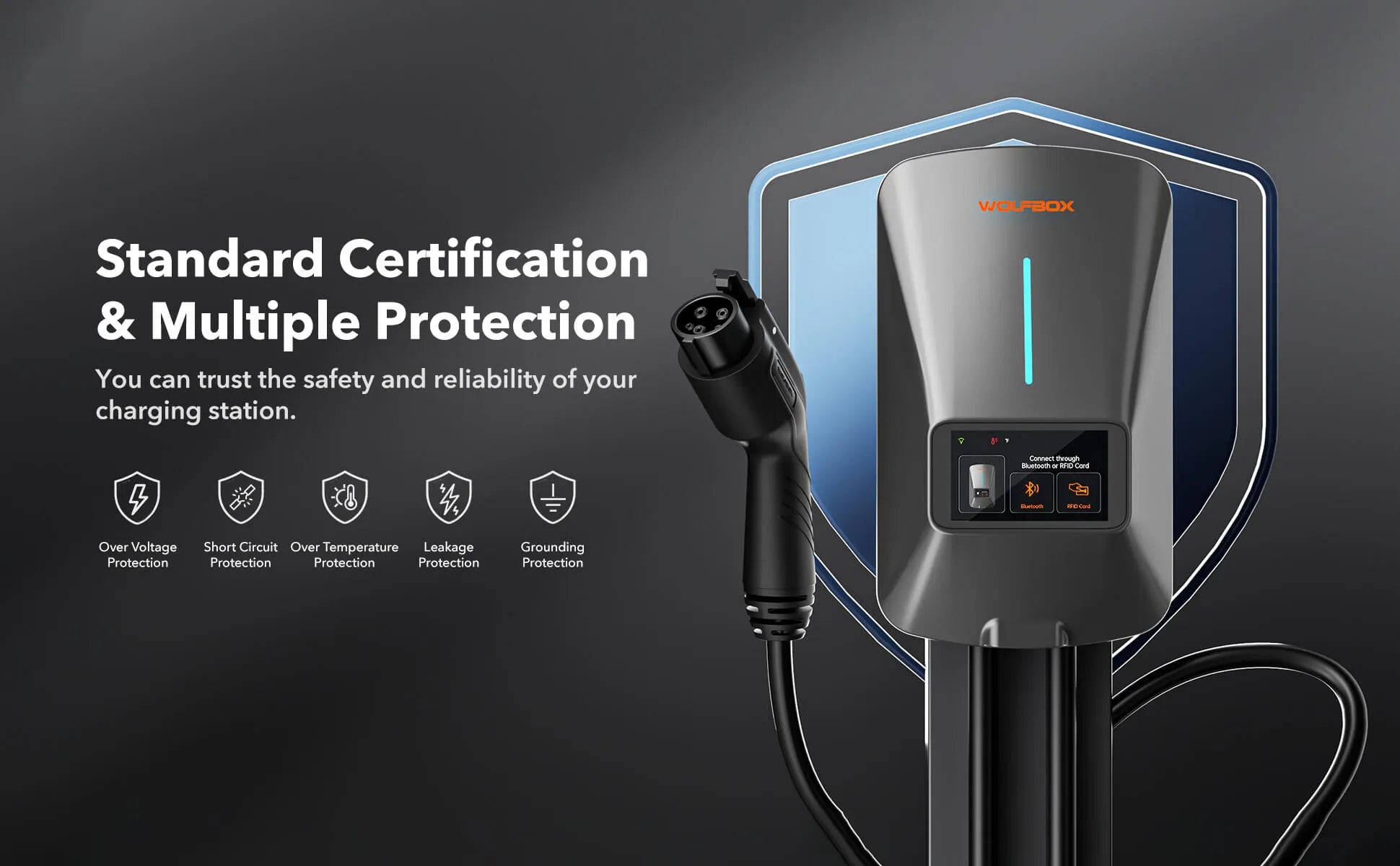WOLFBOX Smart Electric Vehicle(EV)Charger is an intelligent, multi-functional charger, with all-around intelligent management of the charging state and charging process, to ensure the efficiency and stability of charging. The product has been fully upgraded in terms of performance so that you can buy with more confidence and peace of mind. Whether at home or out, WOLFBOX Level 2 EV Charger is your best choice, reflecting the concept of intelligent, efficient, safe, and convenient charging