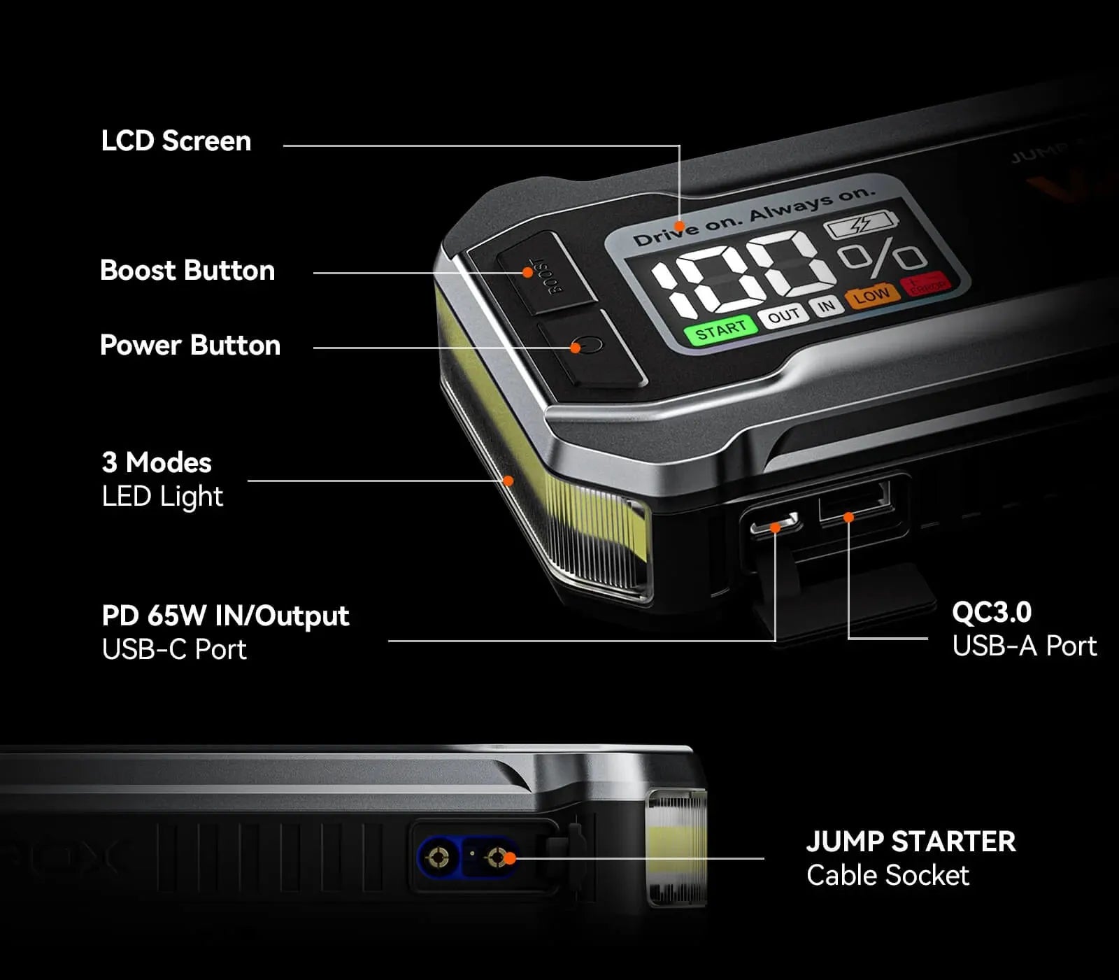 Our jump starter tackles emergencies with three lighting modes: steady, strobe, and SOS, for visibility, alerts, and signalswhen you need them most.