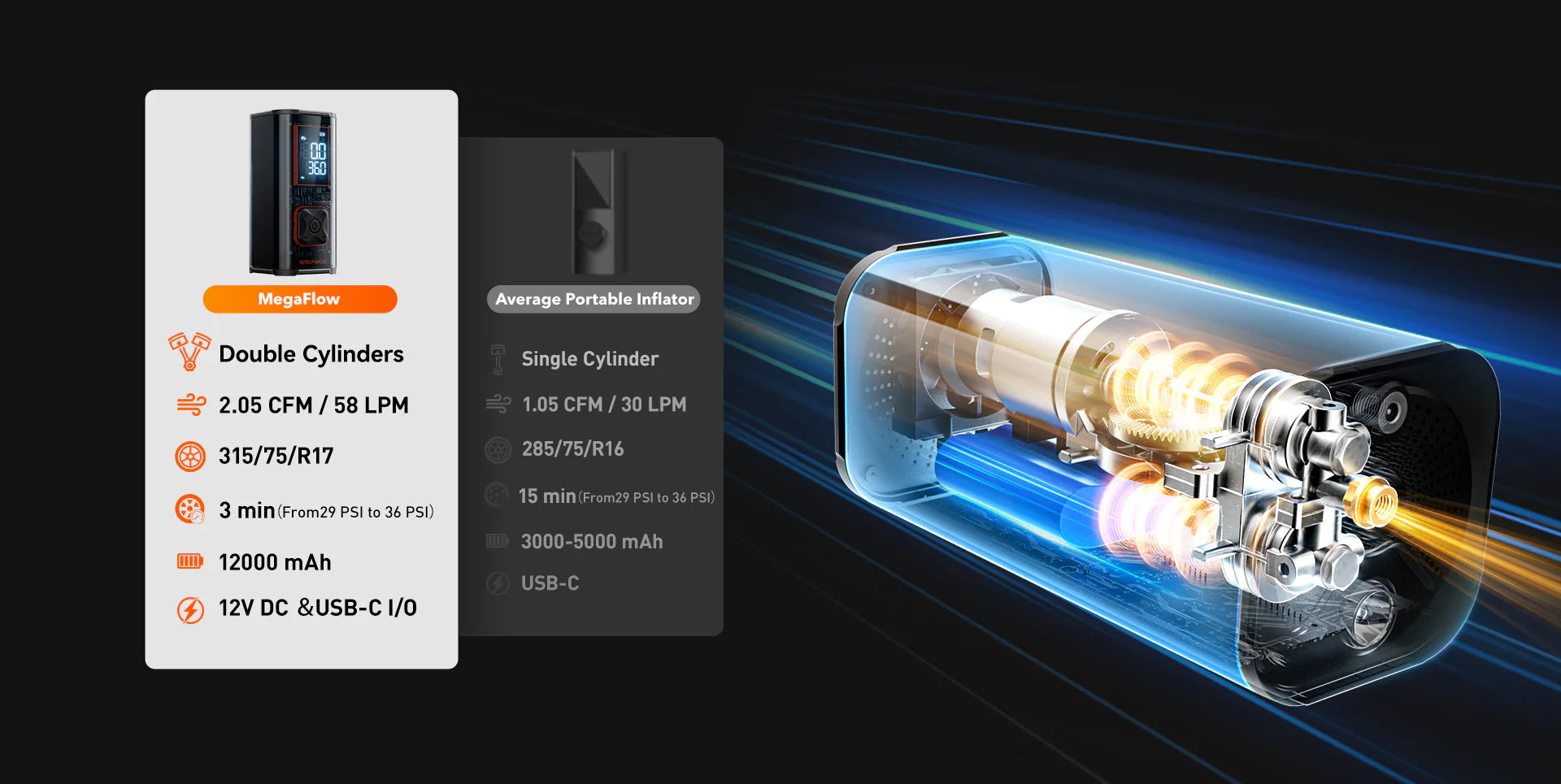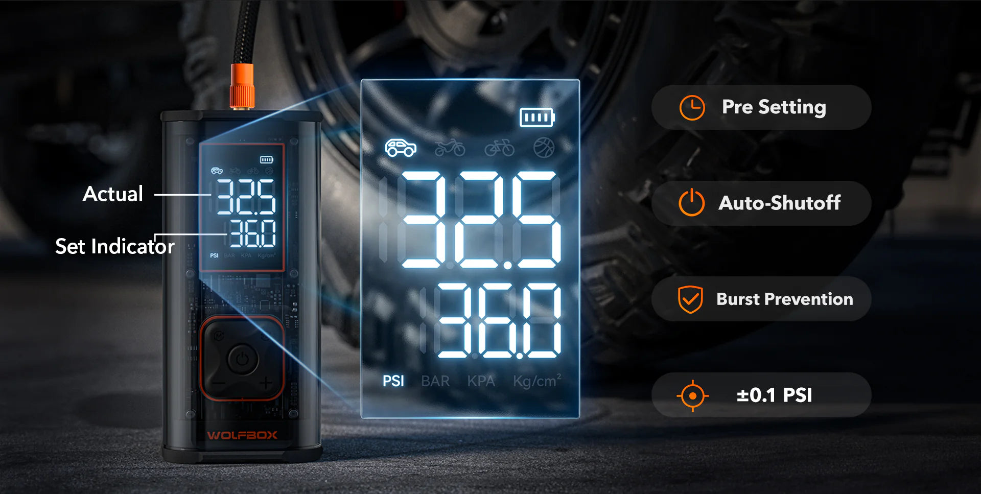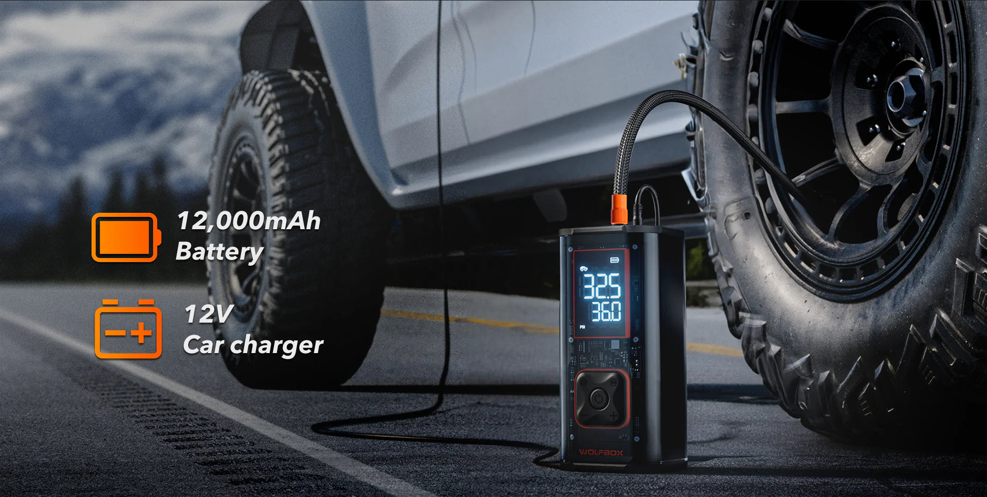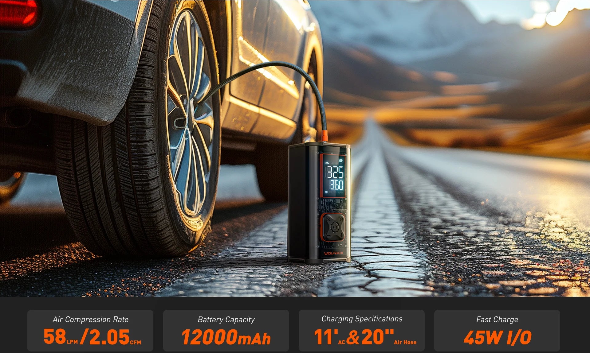 - Experience Effortless Inflation with WOLFBOX MegaFlow 24 Pro Tire Inflator - Featuring a 58LPM Air Flow and 12,000mAh Power for Maximum Convenience.