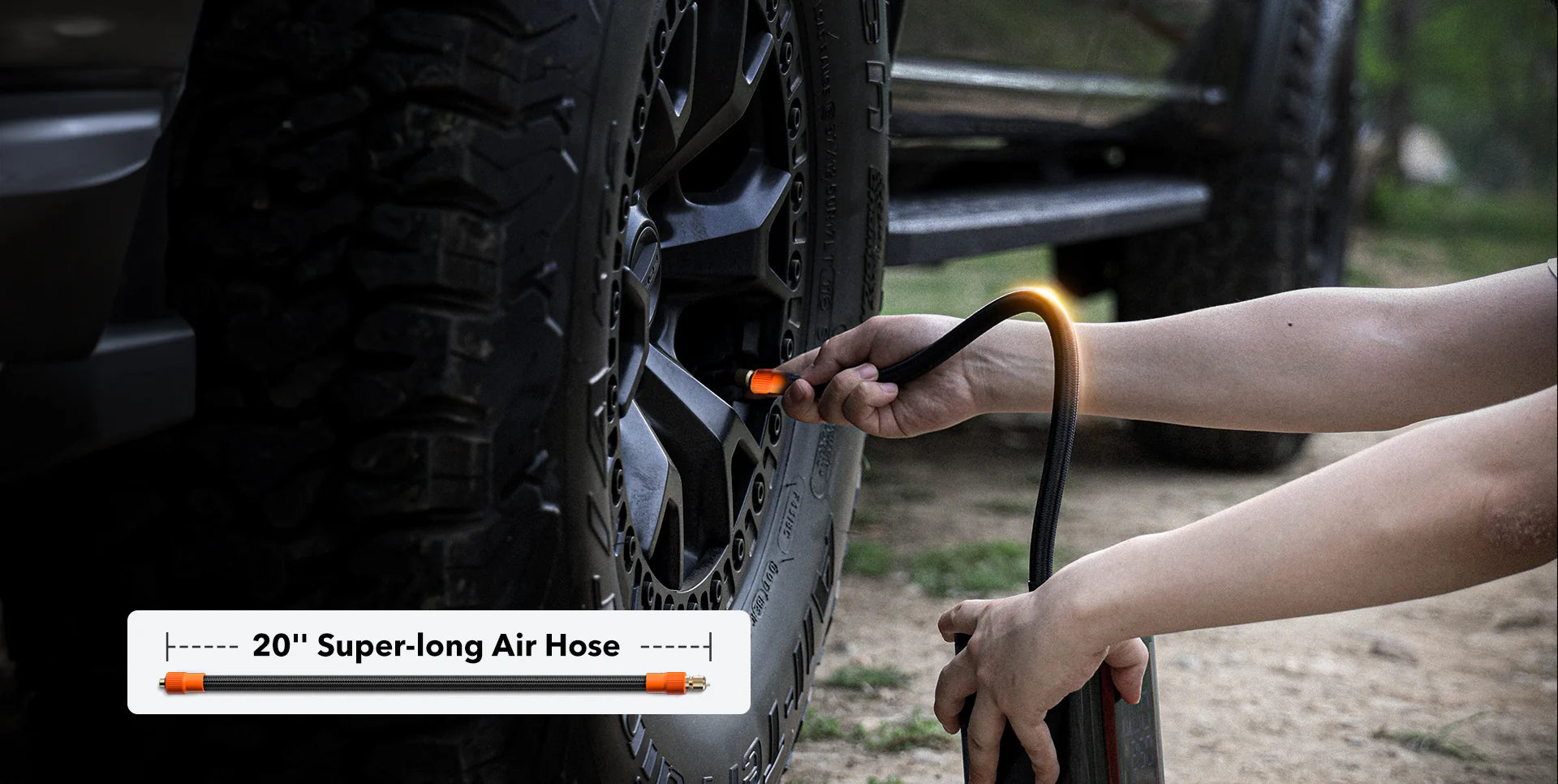 - 11' Power Cord and 20" Air Hose for Unmatched Reach Whether using the 12V DC or built-in battery mode, the generous cord and hose lengths allow you to easily reach any tire, no matter the size of your vehicle.